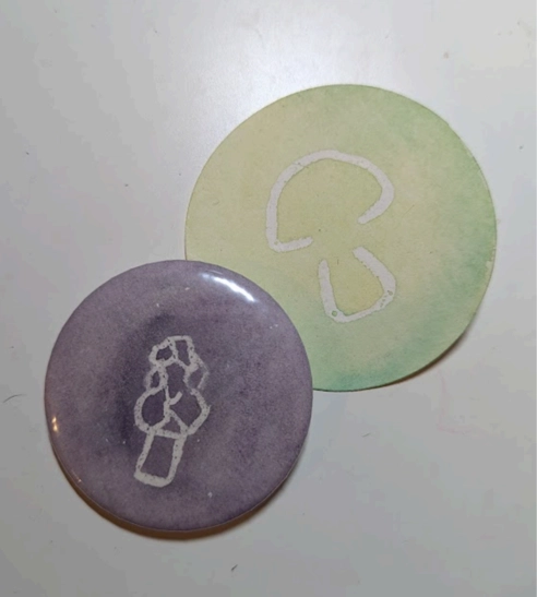 Design your own mushroom buttons and we'll mount them on a pin for you. For some extra “pop”, use white crayon and dark watercolors to make your mushrooms magically appear! Perfect for all ages.